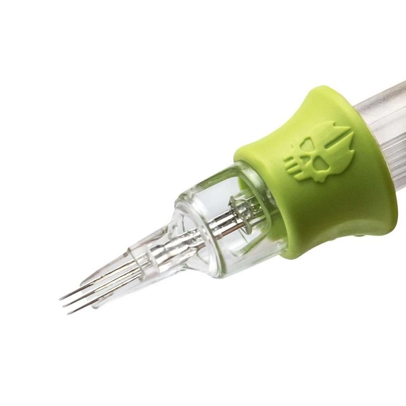 La particularité des cartouches Magnum Whip Shader est que les aiguilles ne sont pas disposées côte à côte, mais que chaque « aiguille » est constituée de trois ou six aiguilles individuelles.